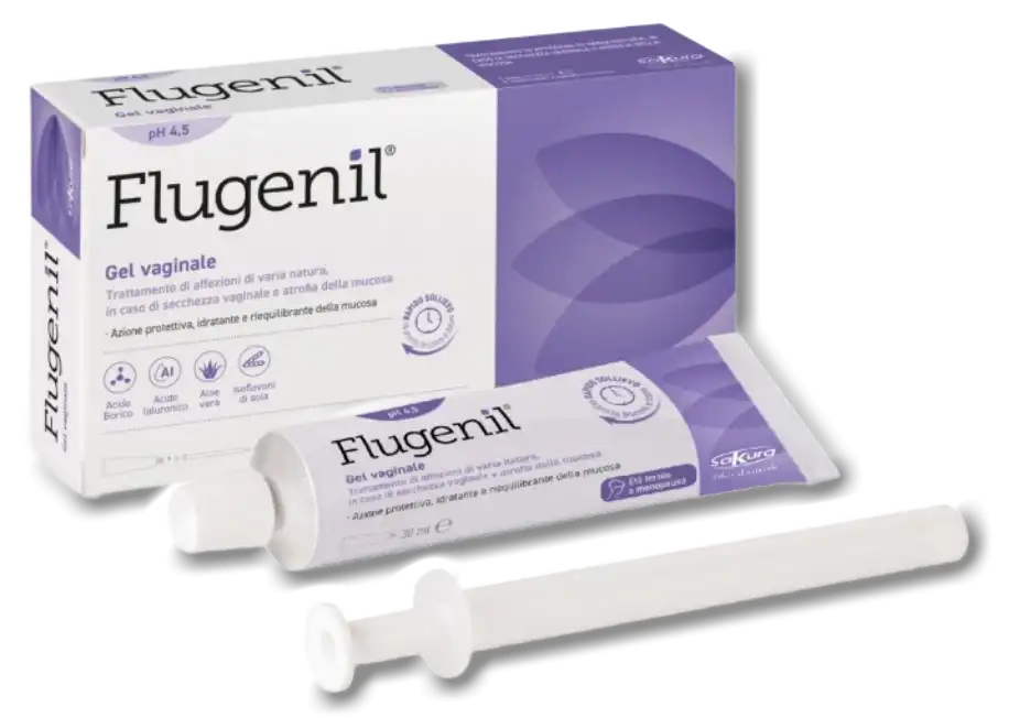 Flugenil® Vaginal Gel is useful in all conditions of vaginal dryness and / or irritation, dyspareunia. Thanks to its natural principles, it helps to nourish the vaginal mucosa, restoring its natural elasticity and softness, preventing irritation and exerting a soothing action. In addition, the presence of hyaluronic acid assists the healing and repair of skin and mucosal lesions. Flugenil® vaginal gel acts quickly against itching and burning and promotes the rebalancing of the vaginal pH in the outcomes of bacterial vaginosis or mycosis (candidiasis).
